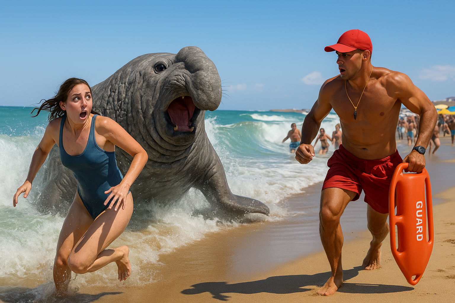 Woman startled by southern elephant seal in Mar del Plata beach water, hurriedly exiting as lifeguard intervenes.