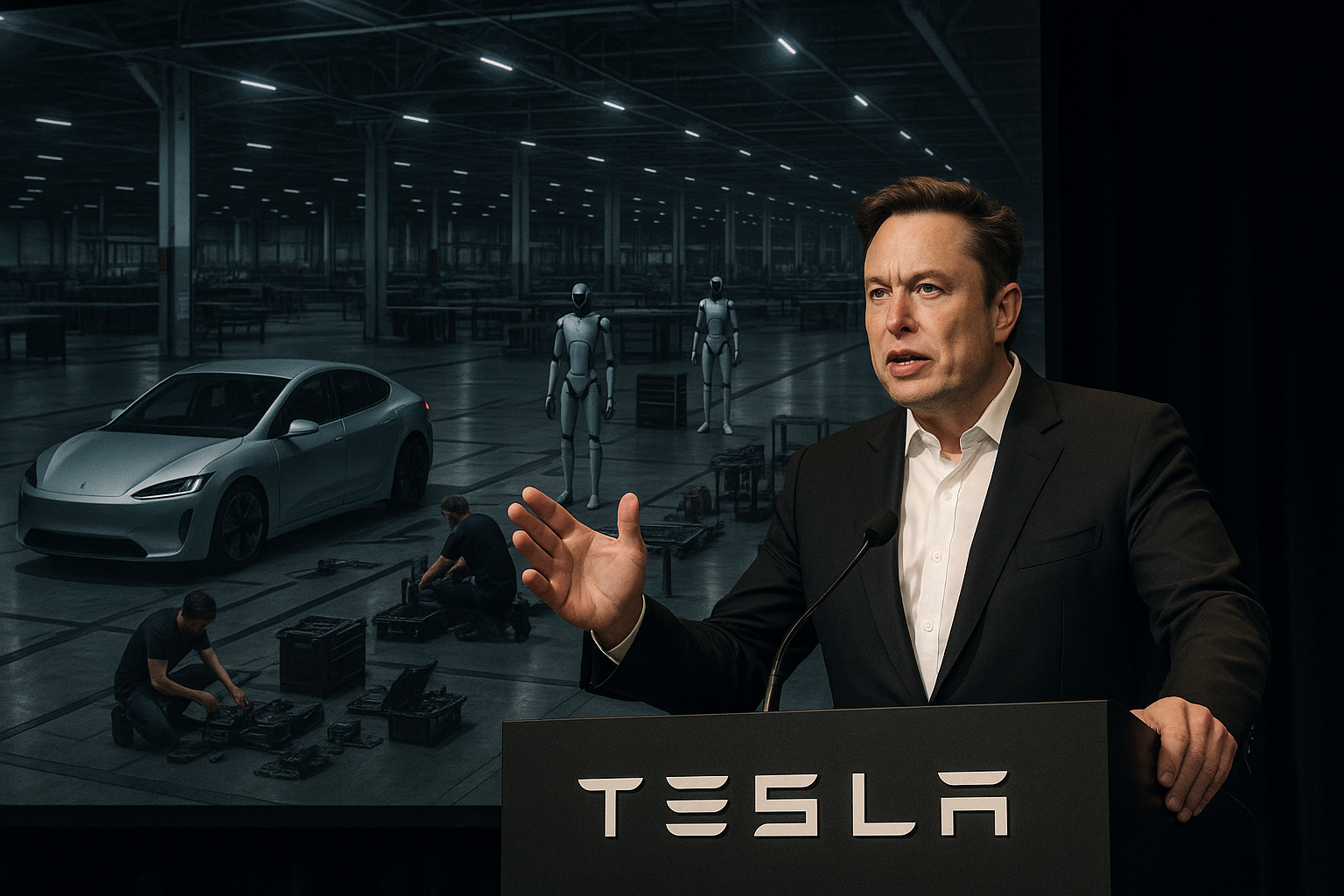 Illustration depicting Tesla stock chart volatility, Elon Musk warning on slow Cybercab and Optimus production, with trading floor and factory elements.