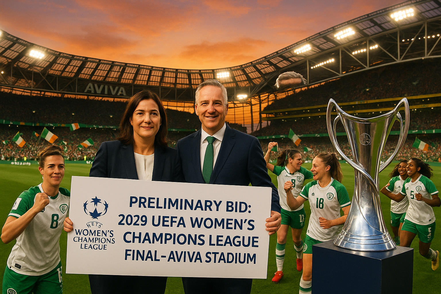 Aviva Stadium in Dublin with FAI officials presenting bid for 2029 UEFA Women's Champions League final, women's football players celebrating.