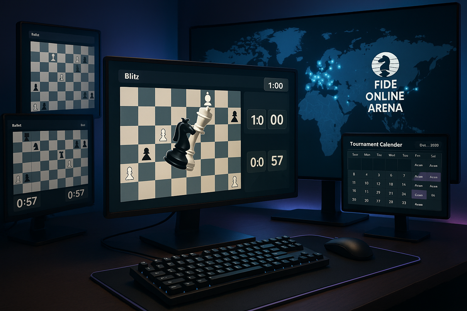 Realistic illustration of FIDE Online Arena's scheduled online chess tournaments, featuring fast-paced games and global competition.