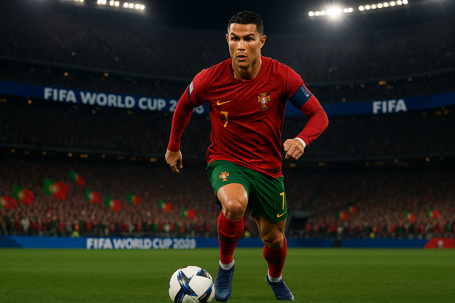 Cristiano Ronaldo playing in the 2026 World Cup opener, symbolizing FIFA's deferral of his suspension.
