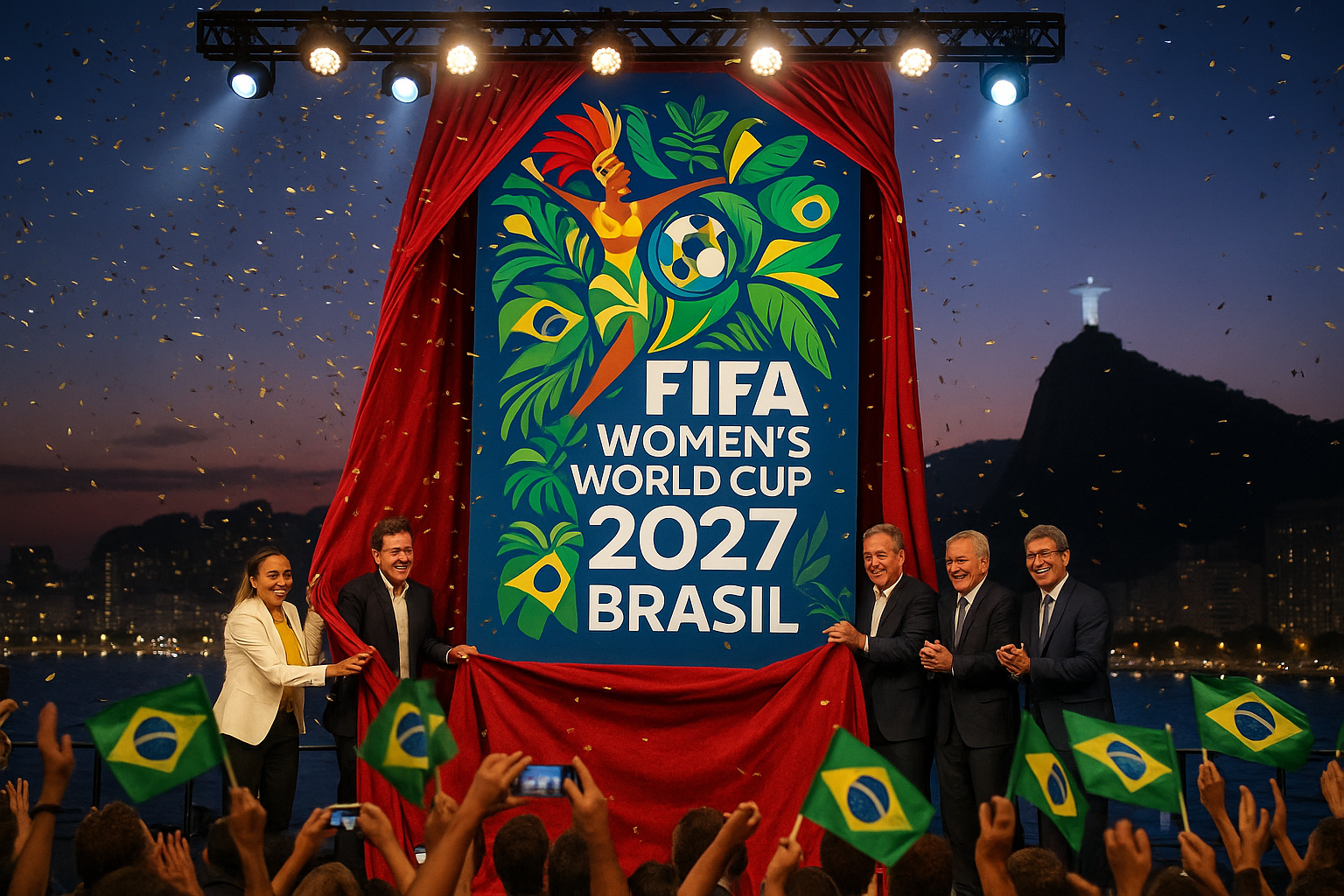 FIFA officials and Brazilian soccer legends unveil the vibrant 2027 Women's World Cup logo at a festive ceremony in Rio de Janeiro.