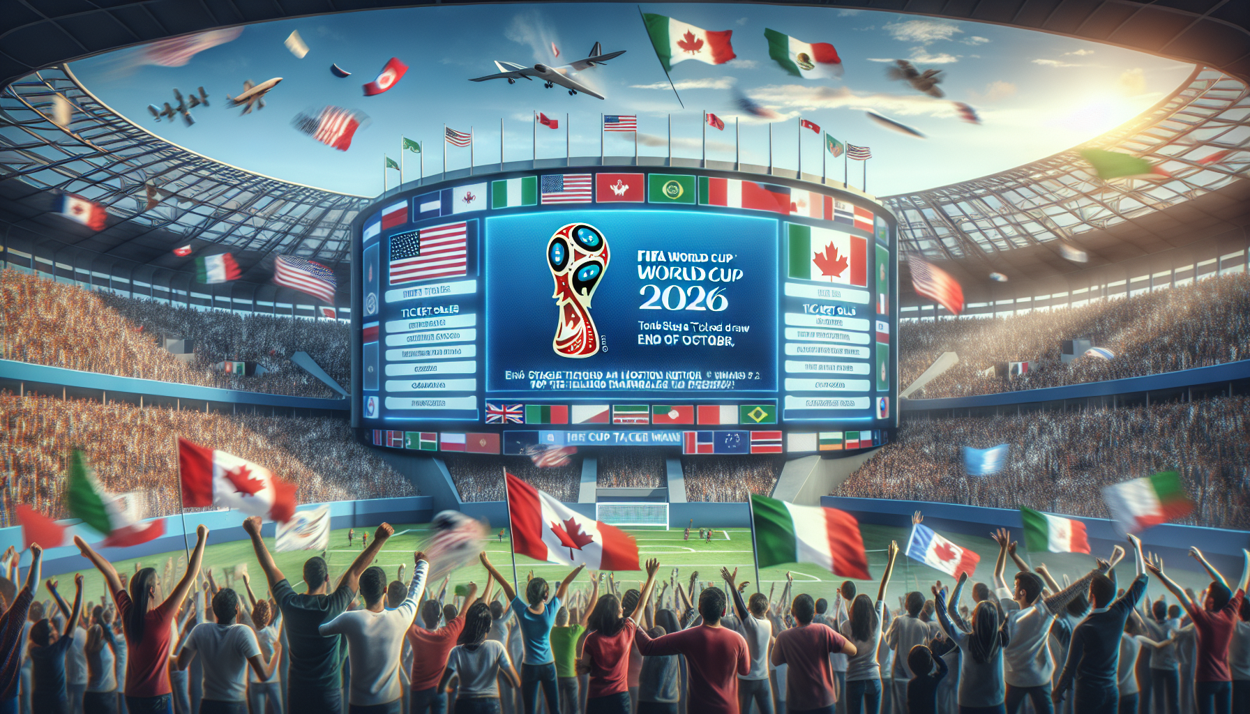 Excited fans from host countries viewing World Cup 2026 ticket sales on a digital screen in a stadium.