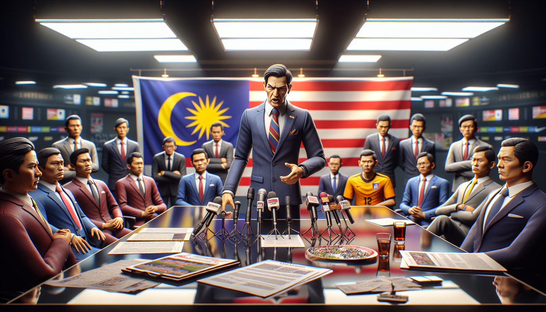 Illustration of FIFA rejecting Malaysia's appeal on fake player documents, showing officials, flags, and disappointed athletes.