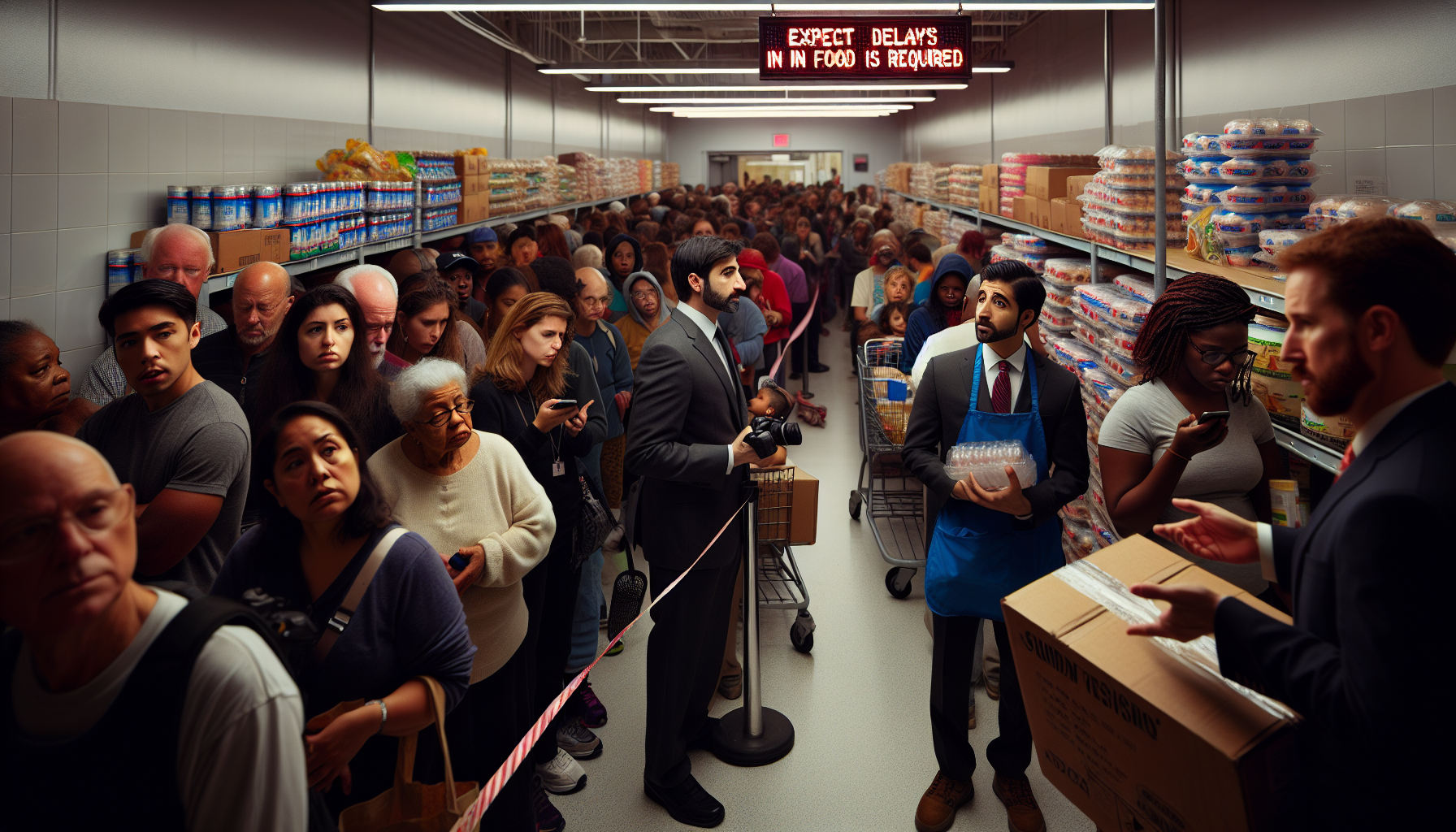 Photo illustrating food bank crisis amid SNAP funding delays due to government shutdown, with people lining up for assistance.