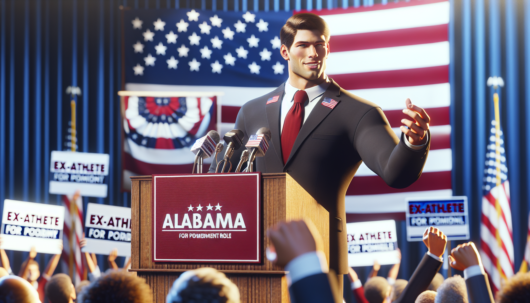 Former Alabama QB AJ McCarron announces his candidacy for lieutenant governor at a lively press event with flags and supporters.
