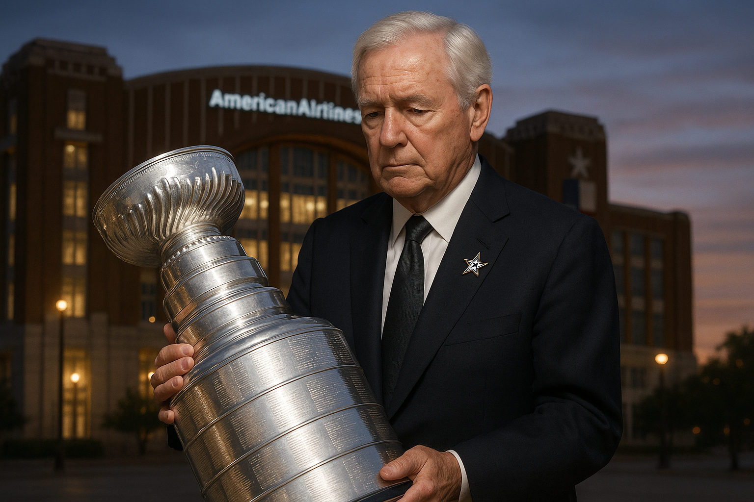 Portrait of former Dallas Stars owner Tom Hicks holding the 1999 Stanley Cup in front of the American Airlines Center.