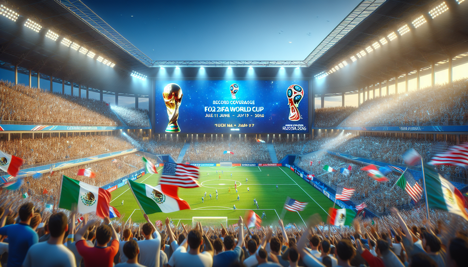 Illustration of a soccer stadium with FOX Sports 2026 FIFA World Cup announcement, featuring flags of host countries and the tournament trophy.