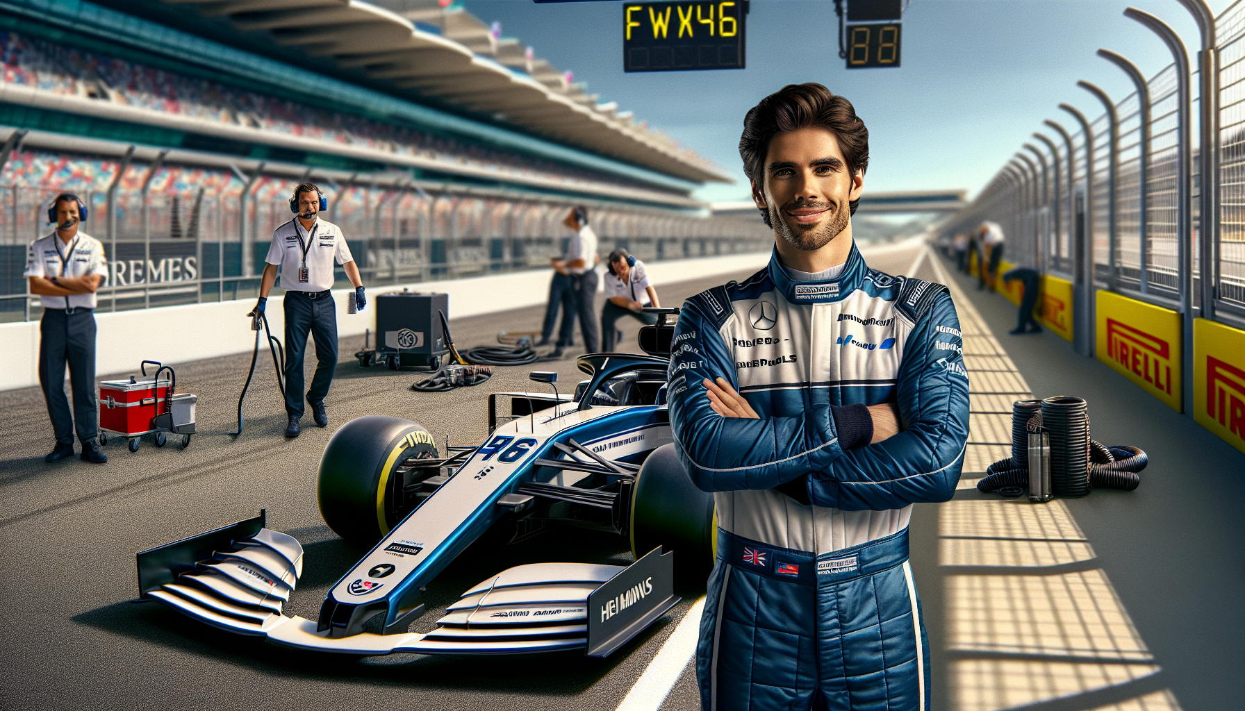 Argentine F1 driver Franco Colapinto smiles confidently next to his Williams car in the pit lane after successful practice sessions at the Mexican Grand Prix.