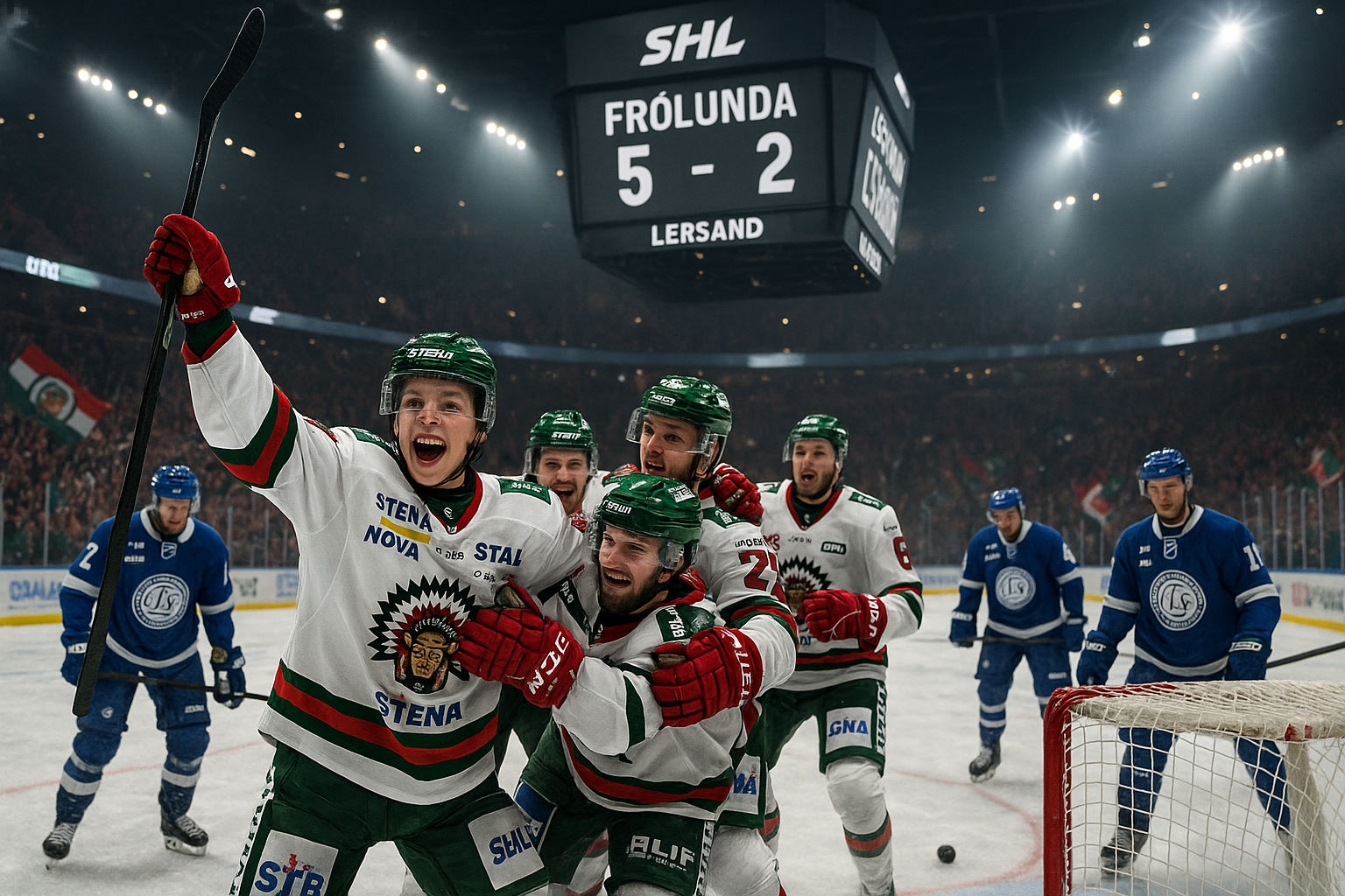 Frölunda players, led by Ivar Stenberg, celebrate 5-2 comeback win over Leksand in SHL hockey game.