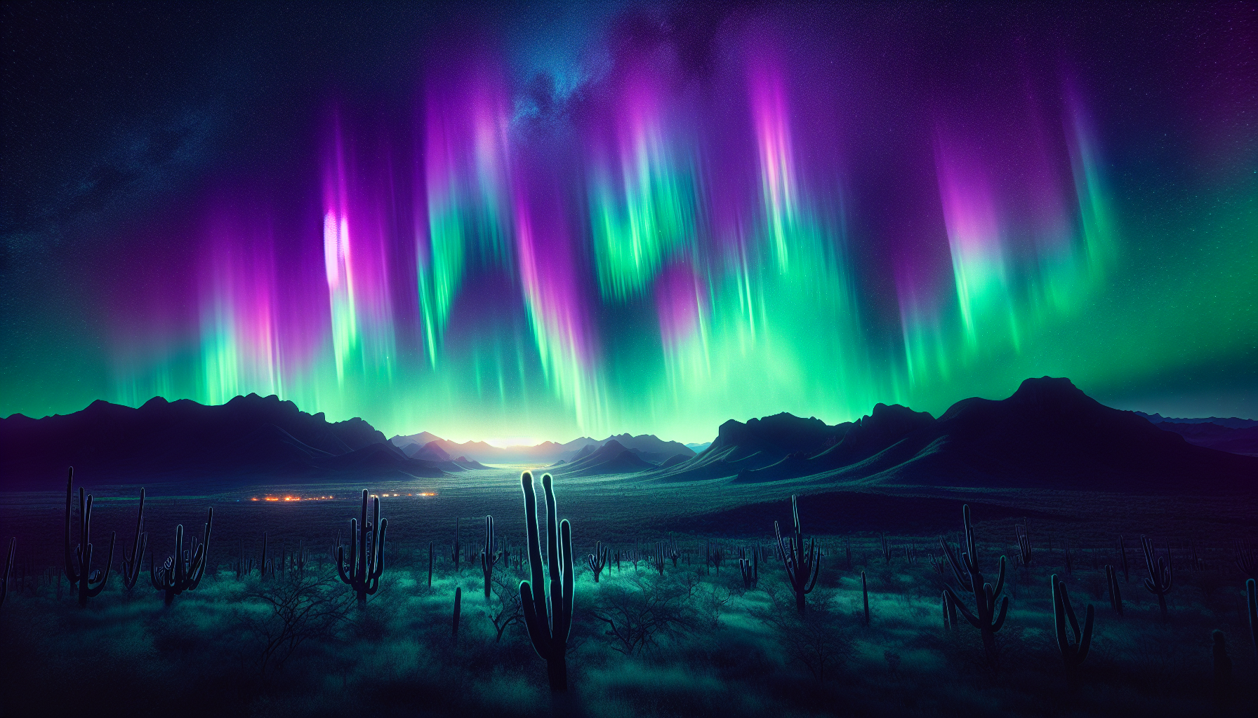 Vibrant green and purple auroras lighting up the night sky over Zacatecas, Mexico, during a geomagnetic storm on November 11, 2025.