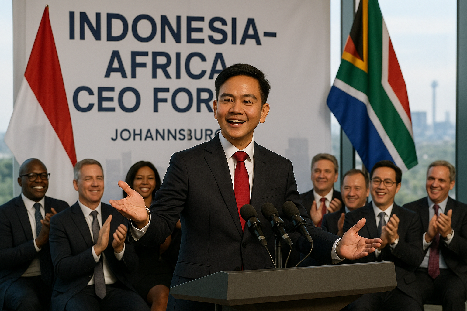 Indonesian VP Gibran Rakabuming Raka announces visa-free policy with South Africa at CEO forum, with flags and applauding executives.
