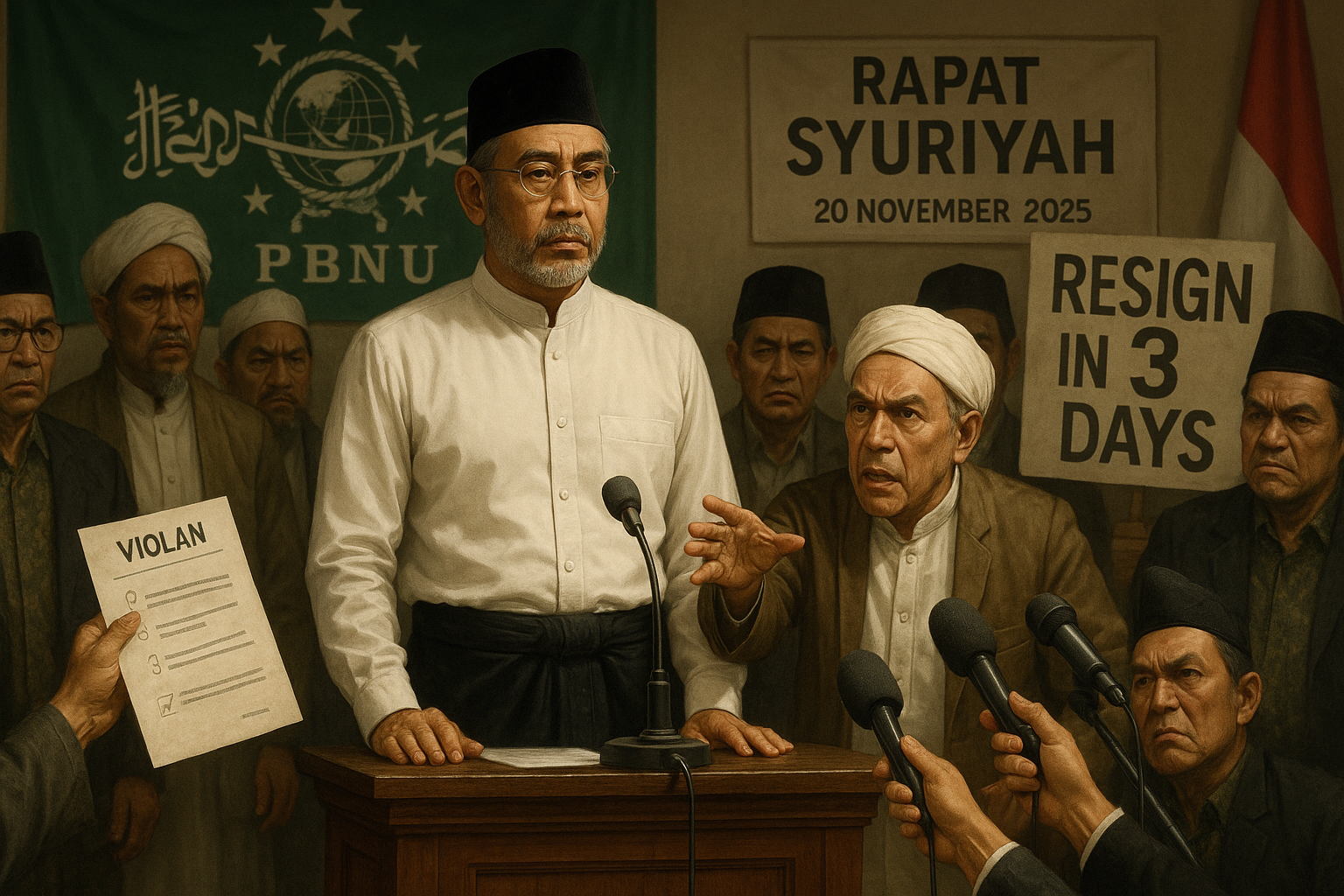On Thursday, November 20, 2025, a closed daily Syuriyah PBNU meeting took place at Hotel Aston City in Jakarta. The meeting produced a decision signed by PBNU's Rais Aam, Miftachul Akhyar, demanding KH Yahya Cholil Staquf's resignation from the General Chairman position.