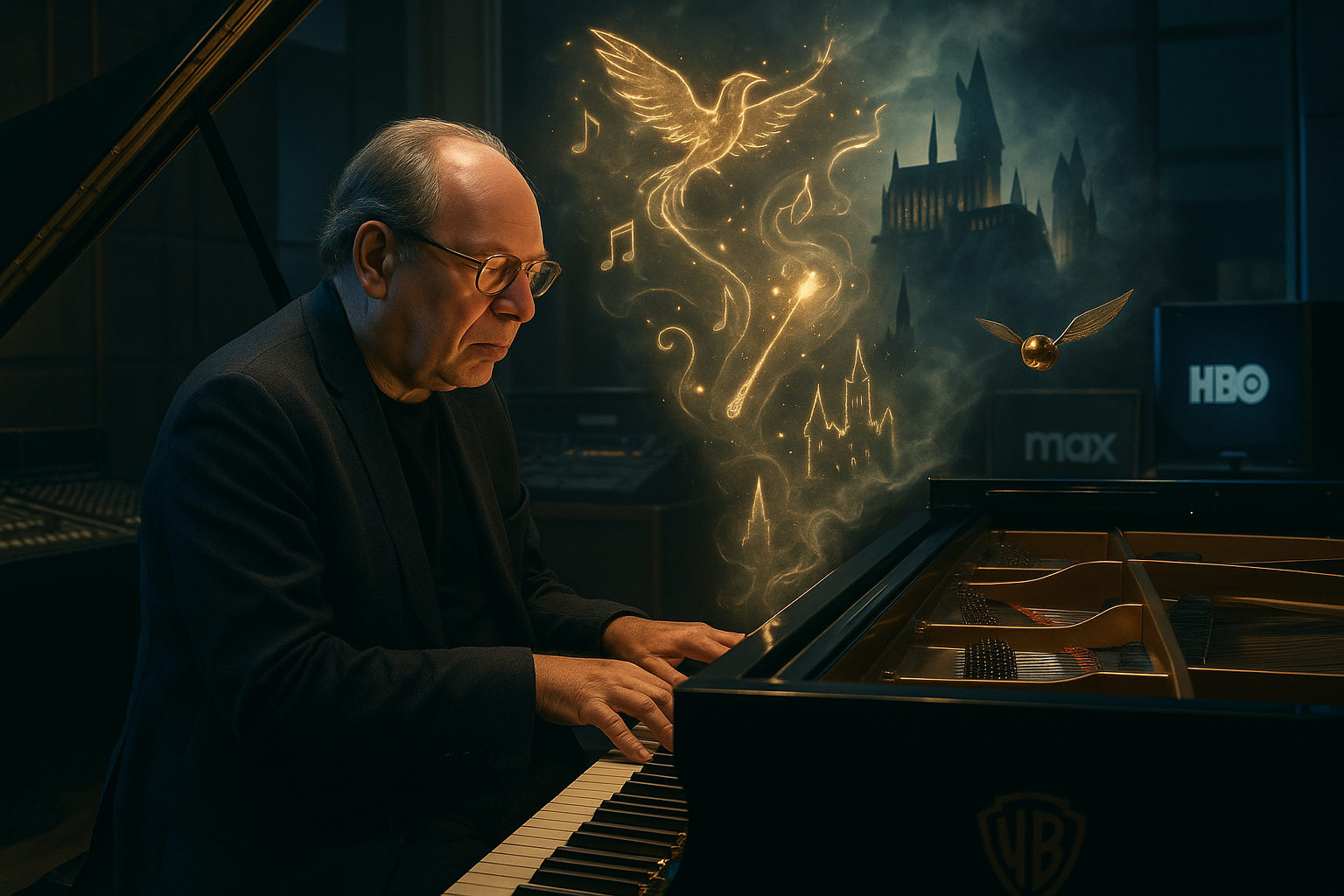 Hans Zimmer composing the score for HBO's Harry Potter TV series in a magical studio setting.