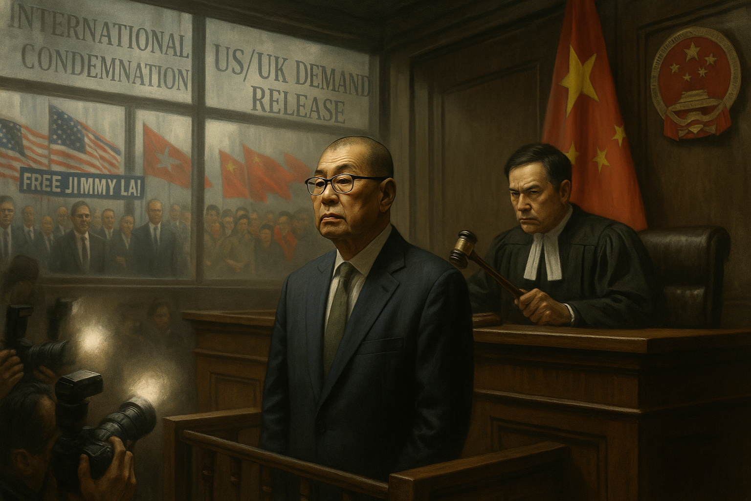 Jimmy Lai in Hong Kong courtroom after guilty verdict on security charges, with contrasting international protests outside.