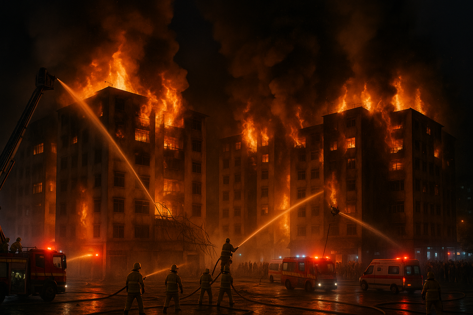 Illustration of the catastrophic fire at Wang Fuk Court in Tai Po, Hong Kong, engulfing seven blocks and claiming at least 159 lives.