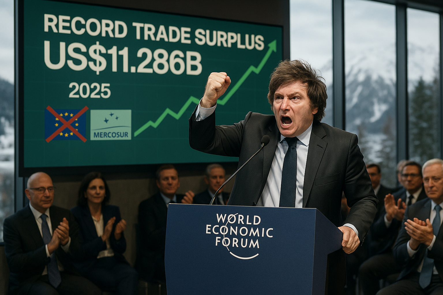 Javier Milei passionately defends trade openness at Davos WEF, with trade surplus graph and EU-Mercosur halt symbols in background.