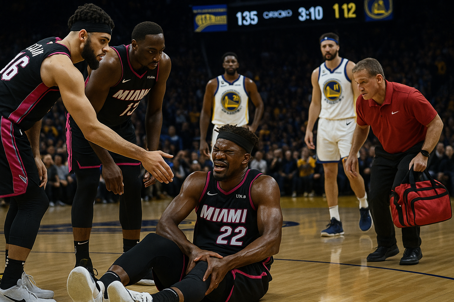 Jimmy Butler in agony clutching his knee after ACL tear during Warriors' victory over Heat.