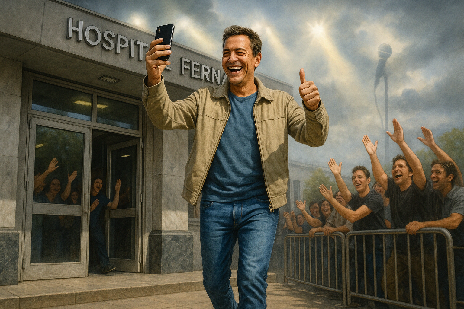 Joaquín Levinton, turf singer, discharged from Hospital Fernández after heart attack, smiles with thumbs-up and symbolic stage lights, vowing return to performing.
