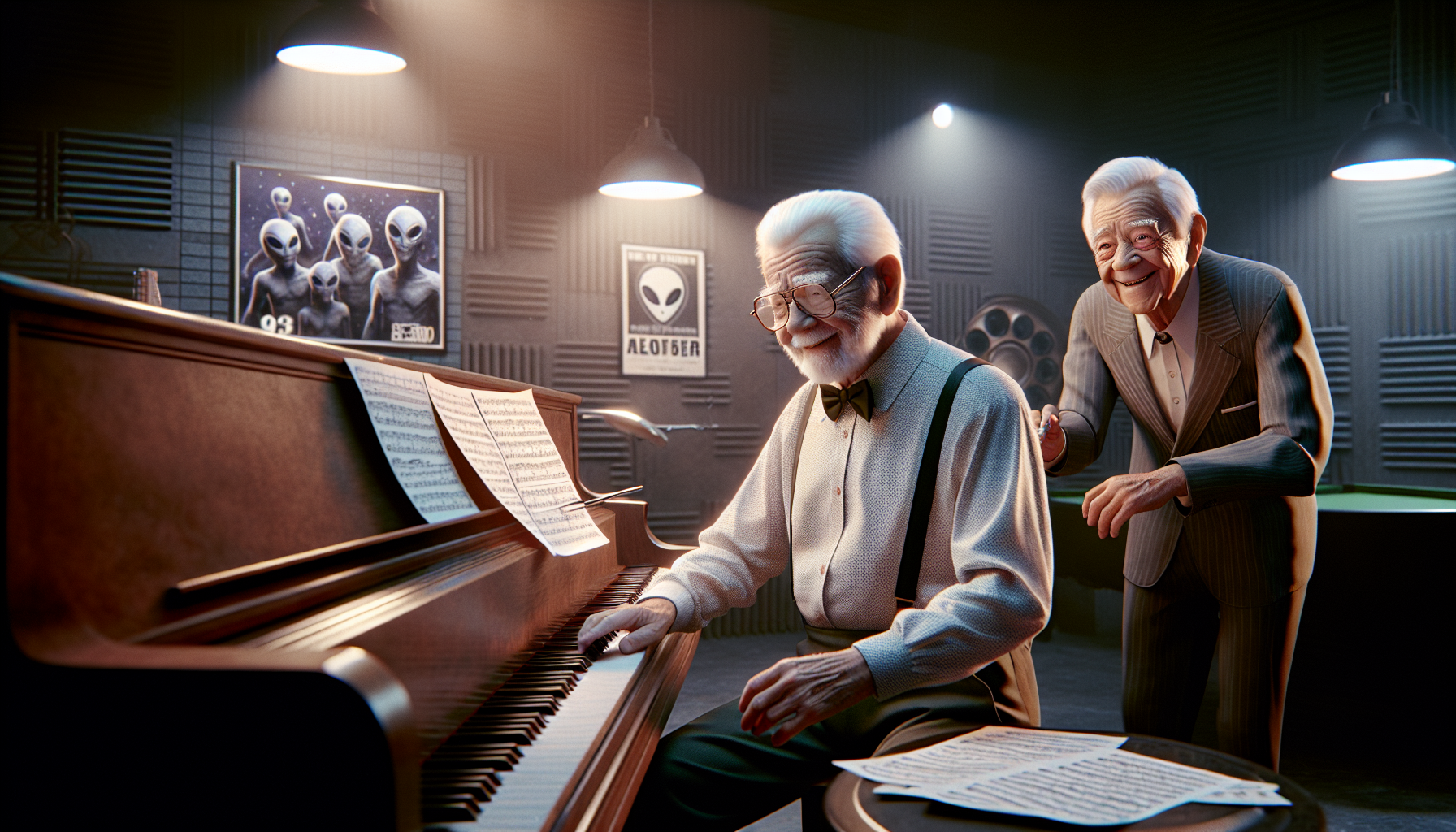 Legendary composer John Williams and director Steven Spielberg collaborating in a music studio with UFO-themed elements, illustrating their upcoming film project.