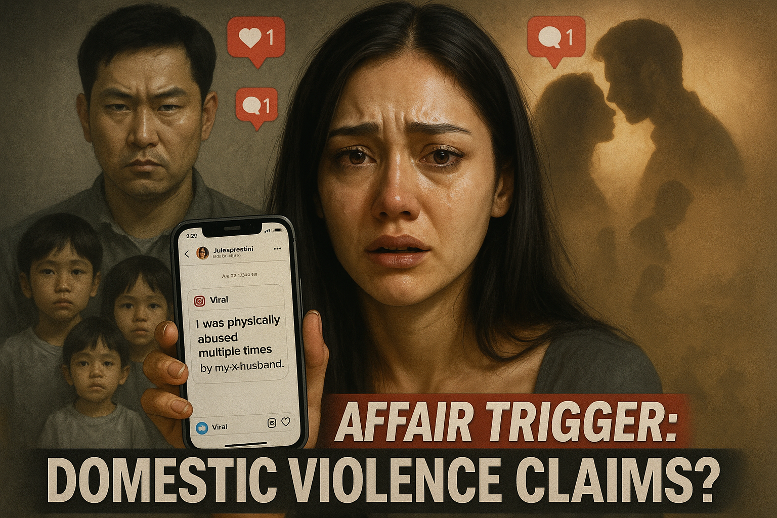 Dramatic illustration of influencer Jule tearfully revealing domestic violence allegations against ex-husband Na Daehoon via Instagram, amid custody and affair scandal.