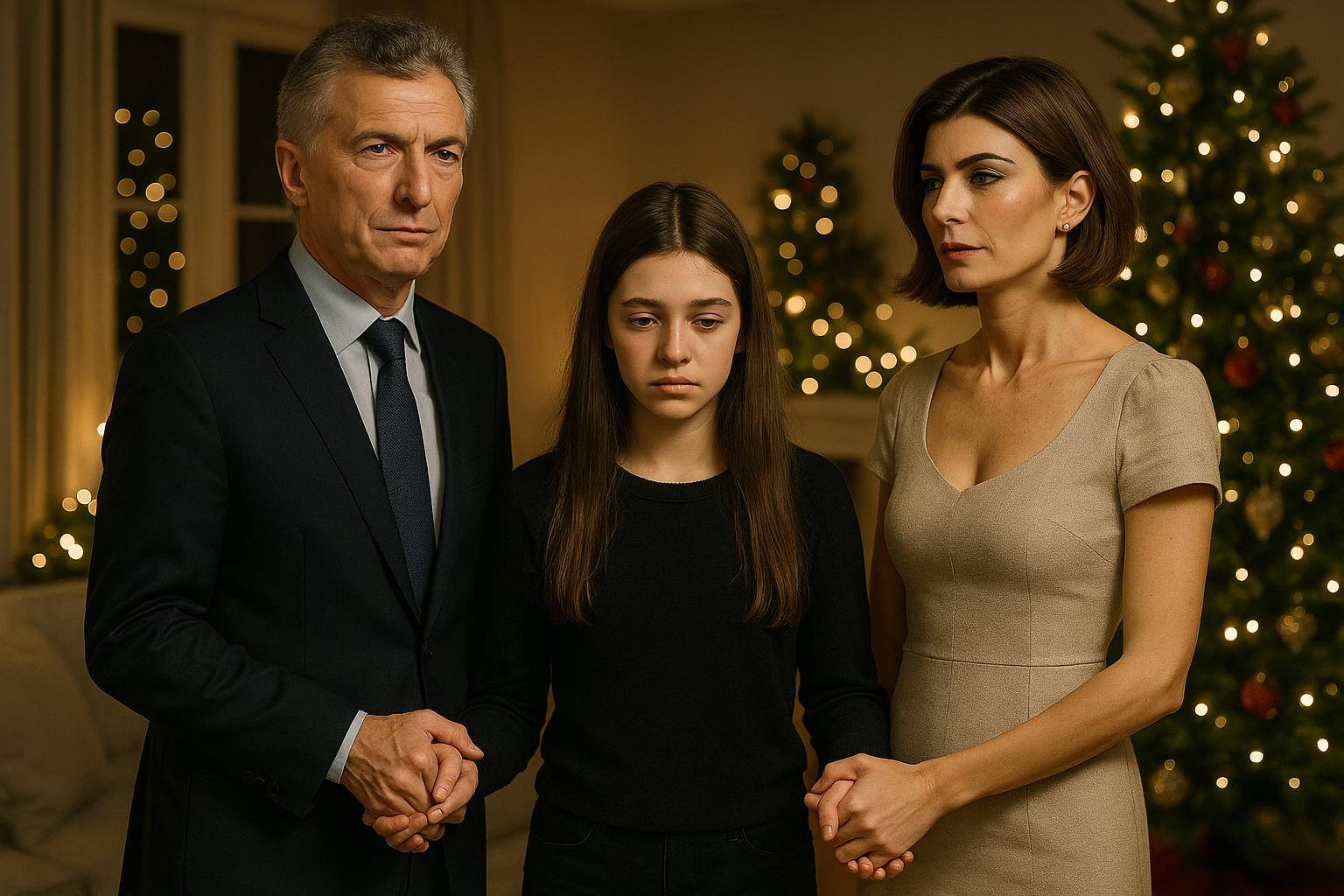 Realistic illustration of Mauricio Macri and Juliana Awada with daughter Antonia in a holiday setting, reflecting their marriage separation.