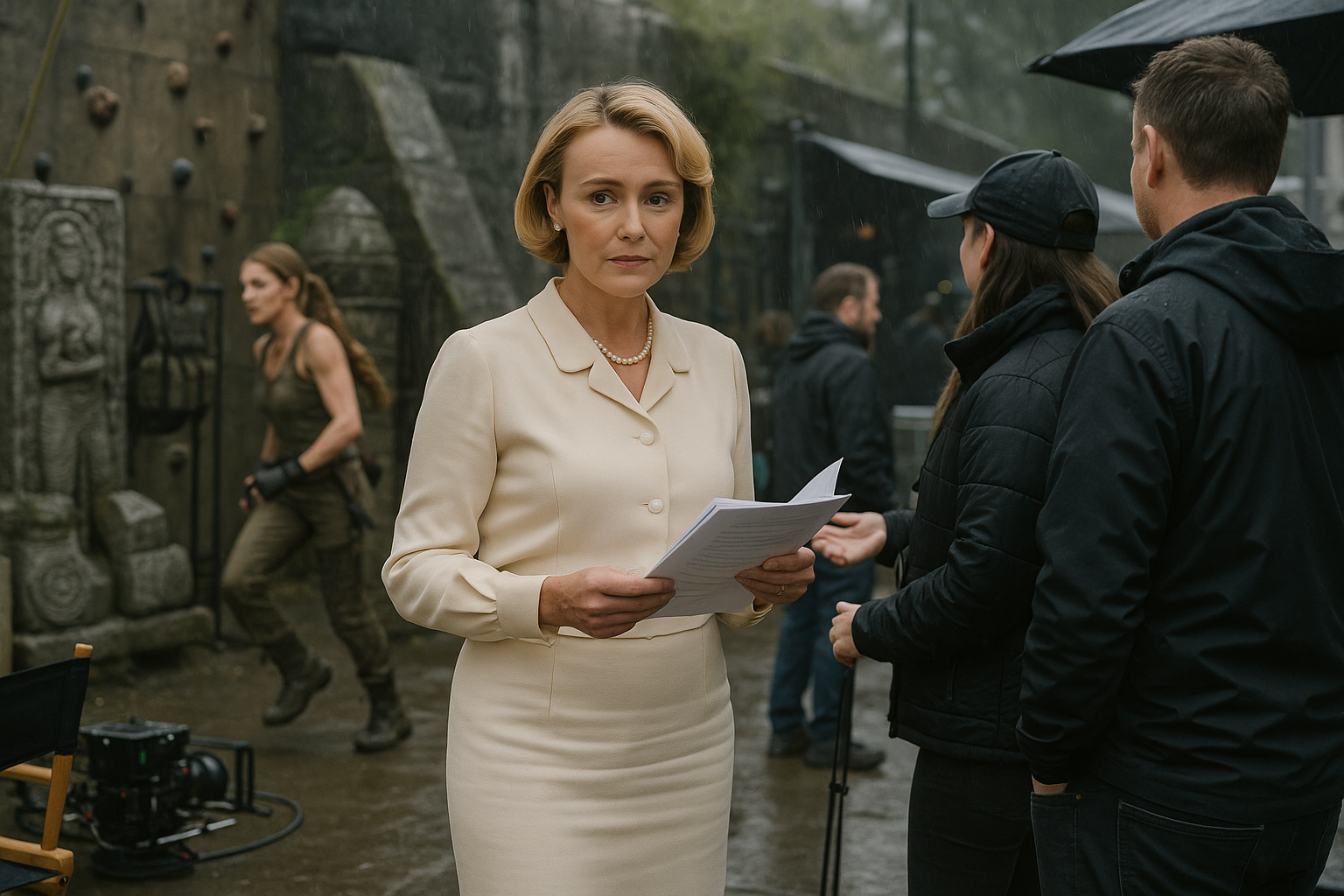 Keeley Hawes spotted on Amazon's Tomb Raider series set, possibly as Lara Croft's mother, amid props and crew.