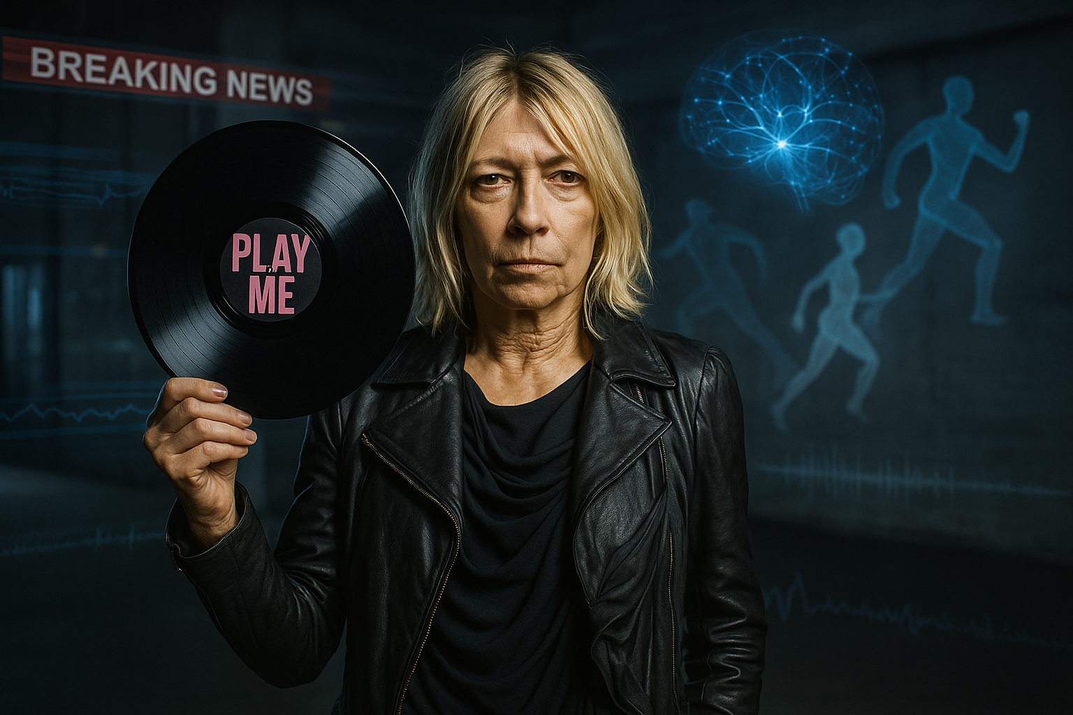 Realistic portrait of Kim Gordon holding her new album 'Play Me', with AI, news, and societal themes in the background, for music news illustration.