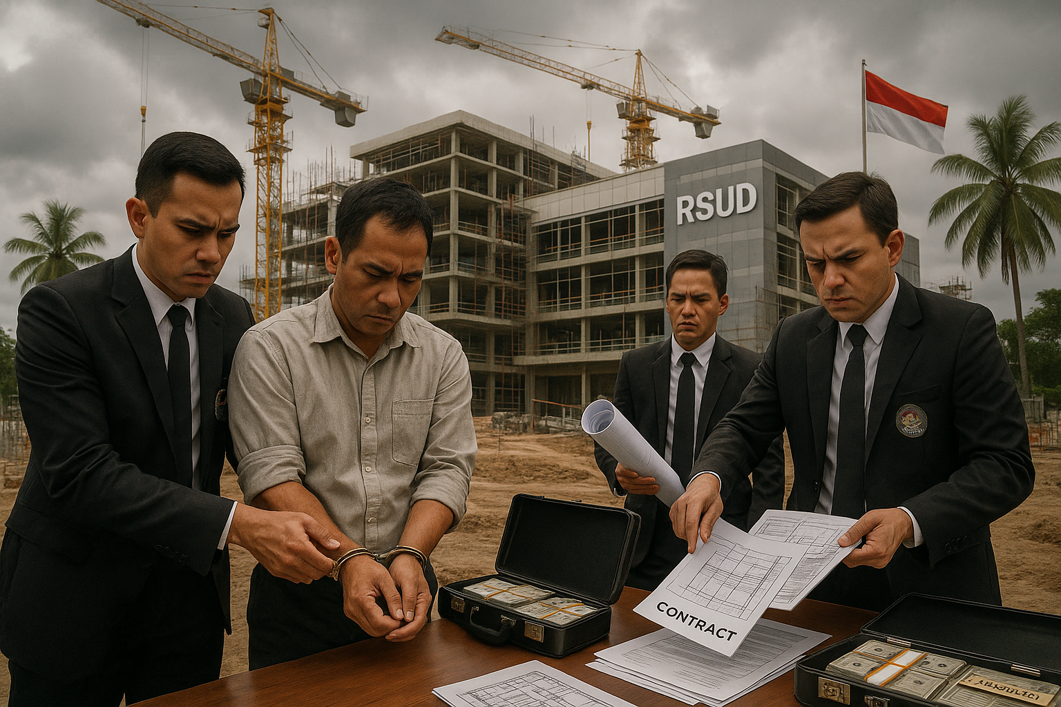 KPK agents investigating corruption evidence at an Indonesian hospital construction site.