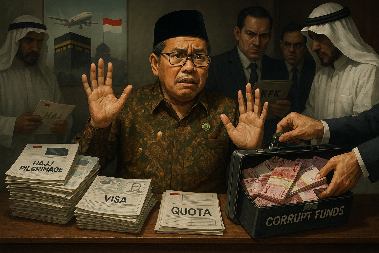 Illustration depicting Nahdlatul Ulama official Aizzudin Abdurrahman suspected by KPK as intermediary in 2023-2024 Hajj quota corruption scandal, with symbols of bribes and investigations.