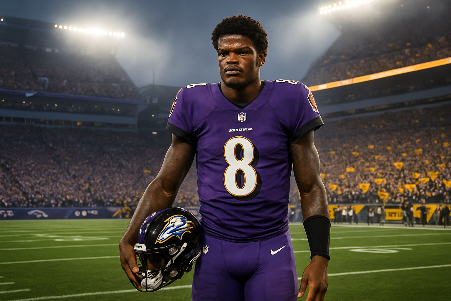 Lamar Jackson of the Ravens poised at Acrisure Stadium ahead of pivotal Steelers AFC North showdown.