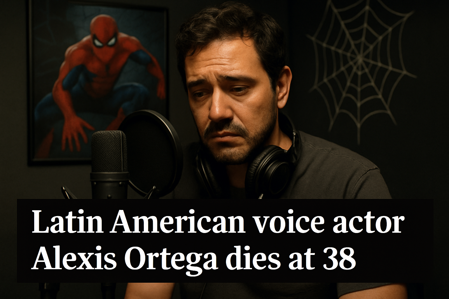 Realistic illustration depicting voice actor Alexis Ortega in a studio with Spider-Man elements and headline of his passing at age 38.