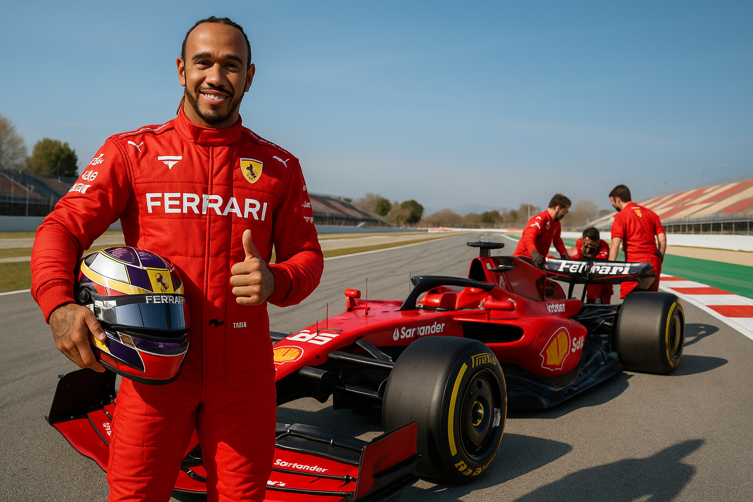Lewis Hamilton smiles confidently beside Ferrari SF-26 after 85 dry shakedown laps at Barcelona, optimistic for 2026 season.