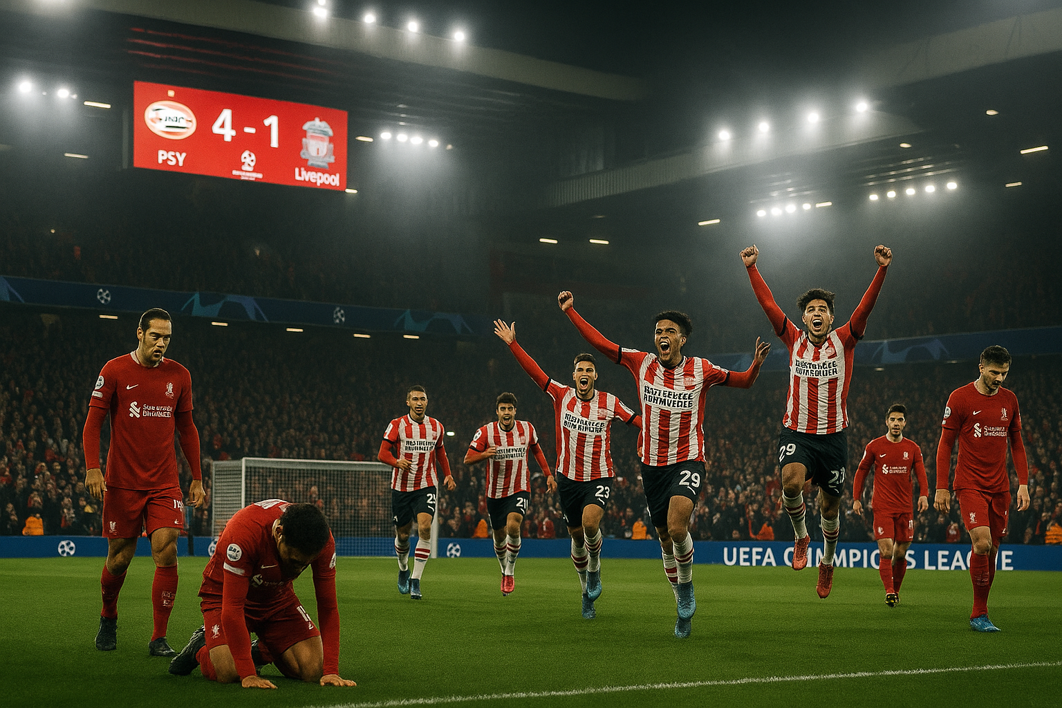 Dramatic illustration of PSV Eindhoven's 4-1 Champions League victory over Liverpool at Anfield, capturing celebration and dejection.