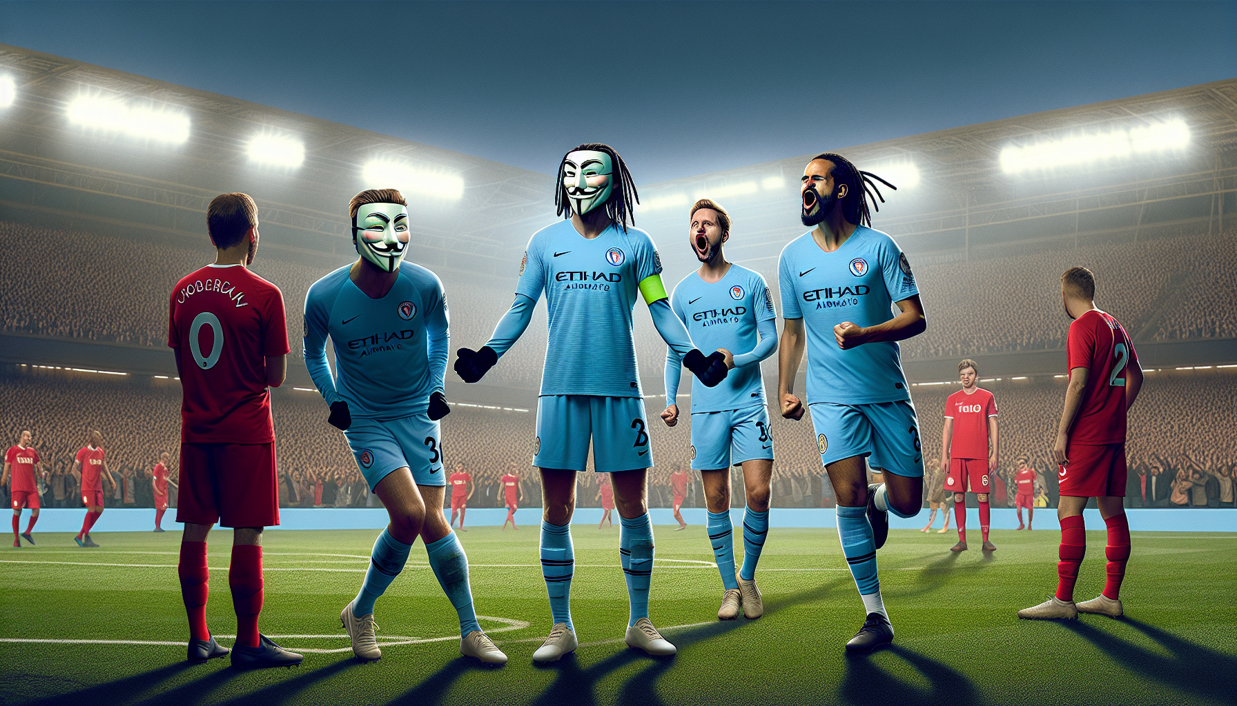 Manchester City players celebrating a goal against a dejected Liverpool team in a Premier League match.