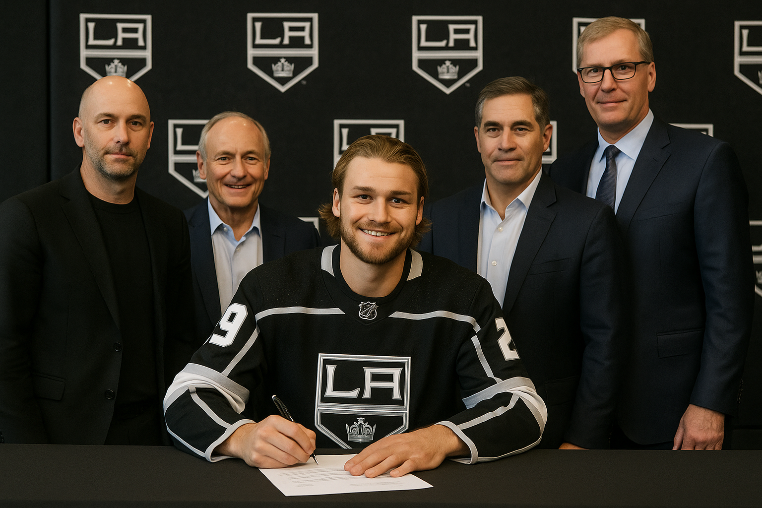Los Angeles Kings forward Adrian Kempe signing his eight-year contract extension with team officials.