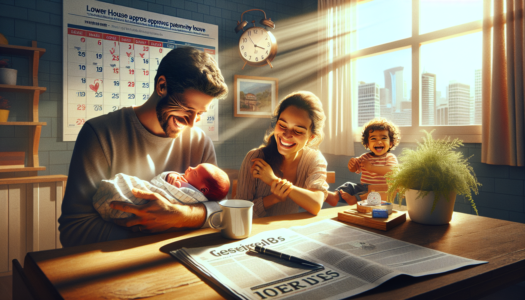 A Brazilian father holding his newborn baby at home, representing the approved extension of paternity leave to 20 days starting in 2027.