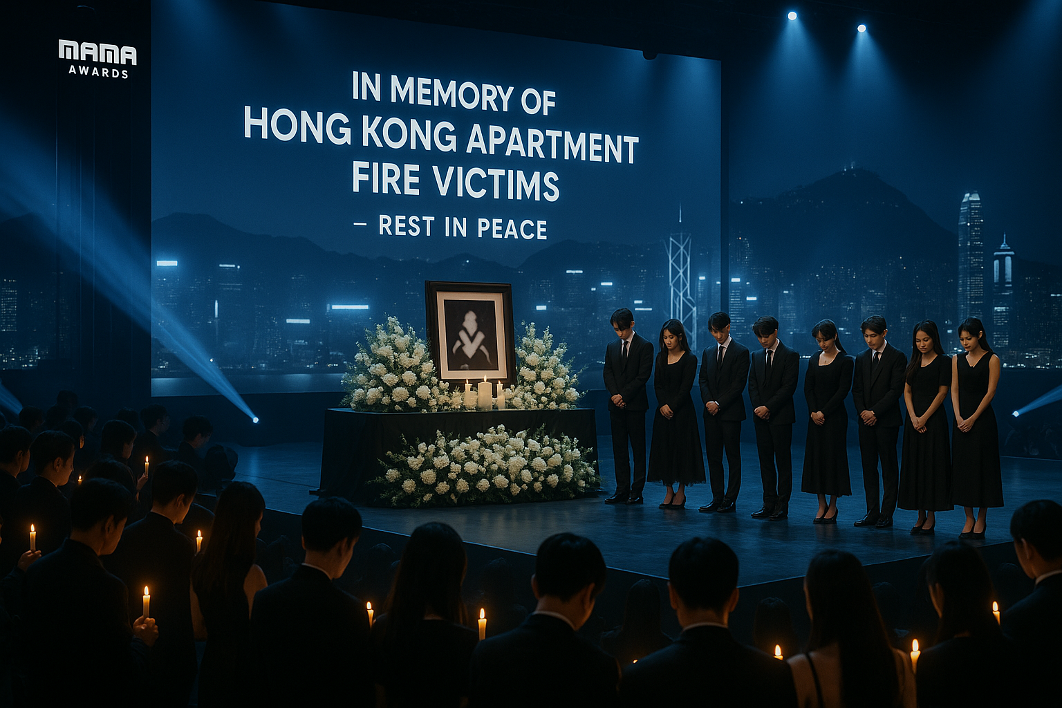 Realistic illustration of MAMA Awards stage opening with a memorial altar for Hong Kong fire victims, K-pop stars in somber pose, audience with candles.