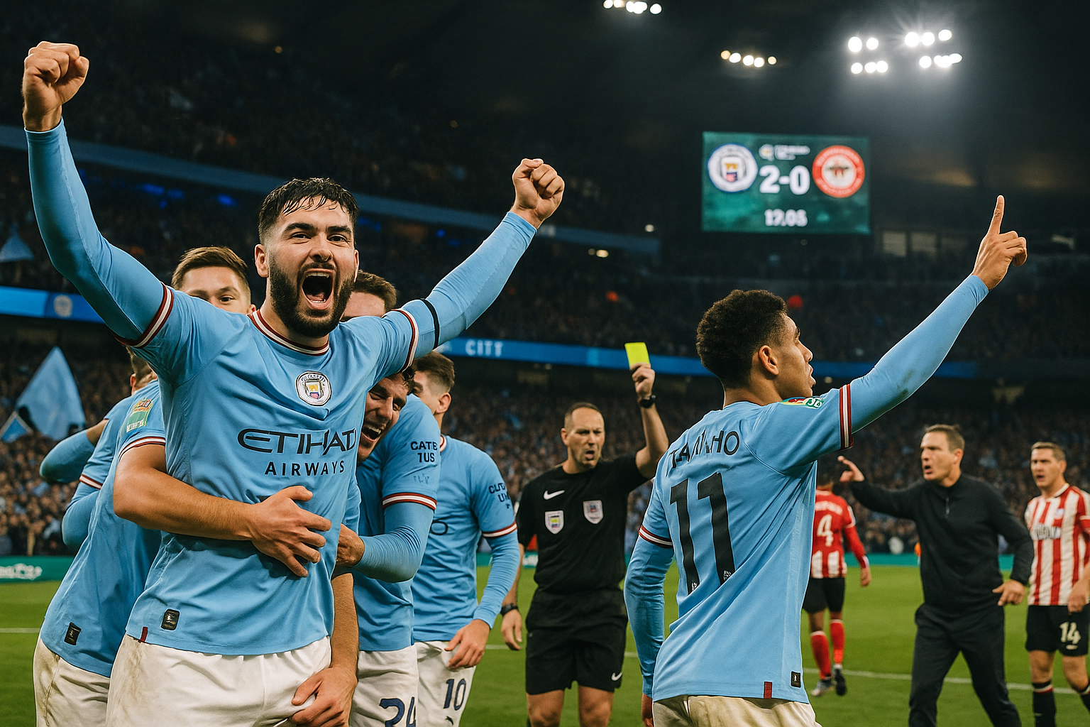 Manchester City players celebrate 2-0 win over Brentford in Carabao Cup quarter-final amid referee controversy at Etihad Stadium.