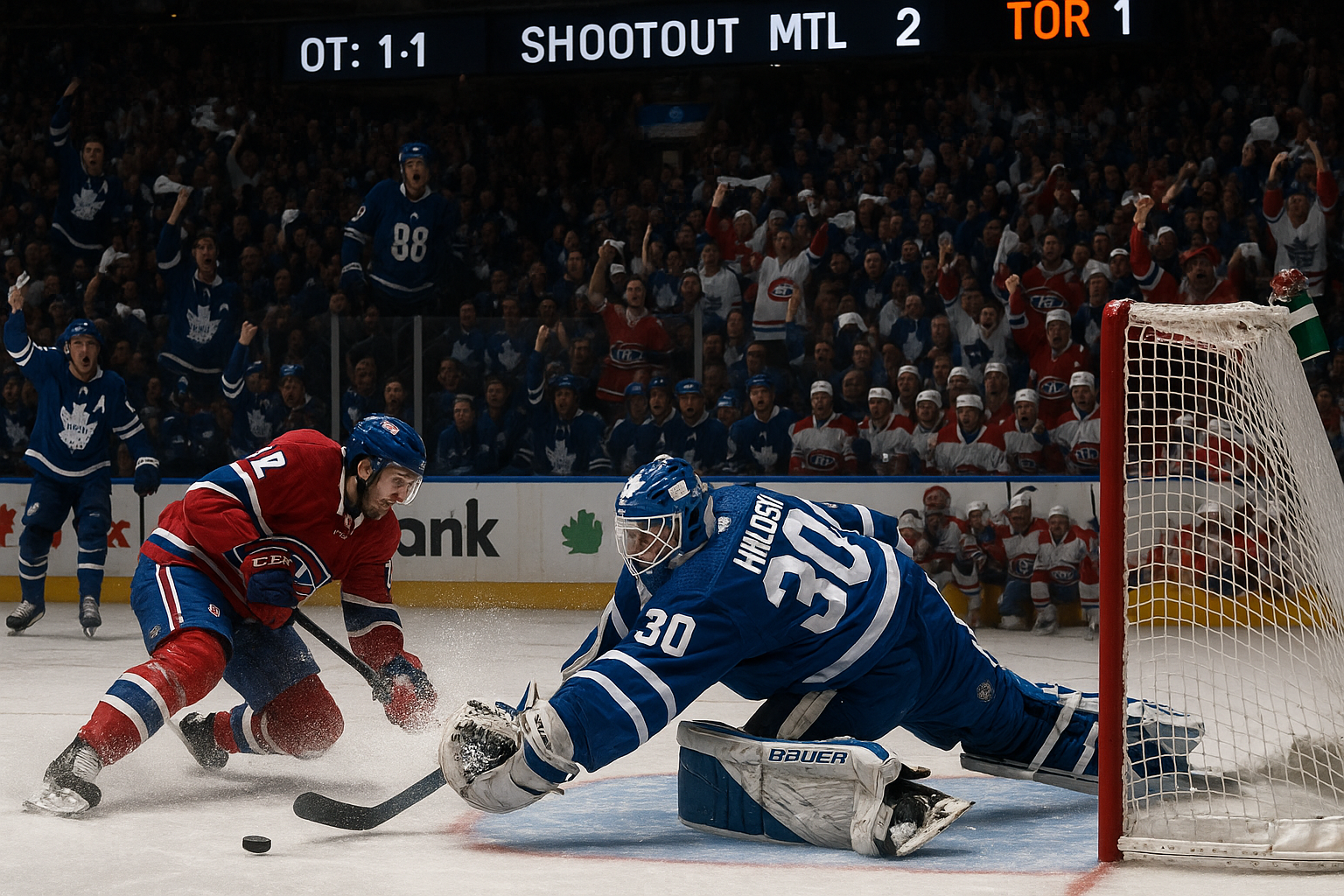 The Toronto Maple Leafs suffered a 2-1 shootout loss to the Montreal Canadiens in a tightly contested game at Scotiabank Arena. Dennis Hildeby made 33 saves in his first start of the season, while Scott Laughton's late third-period goal tied the score and extended his scoring streak to three games. The defeat snapped Toronto's three-game winning streak but earned them a valuable point.