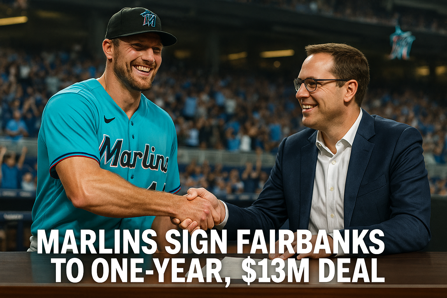 Pete Fairbanks shaking hands with Marlins executive after signing $13M contract, stadium background.