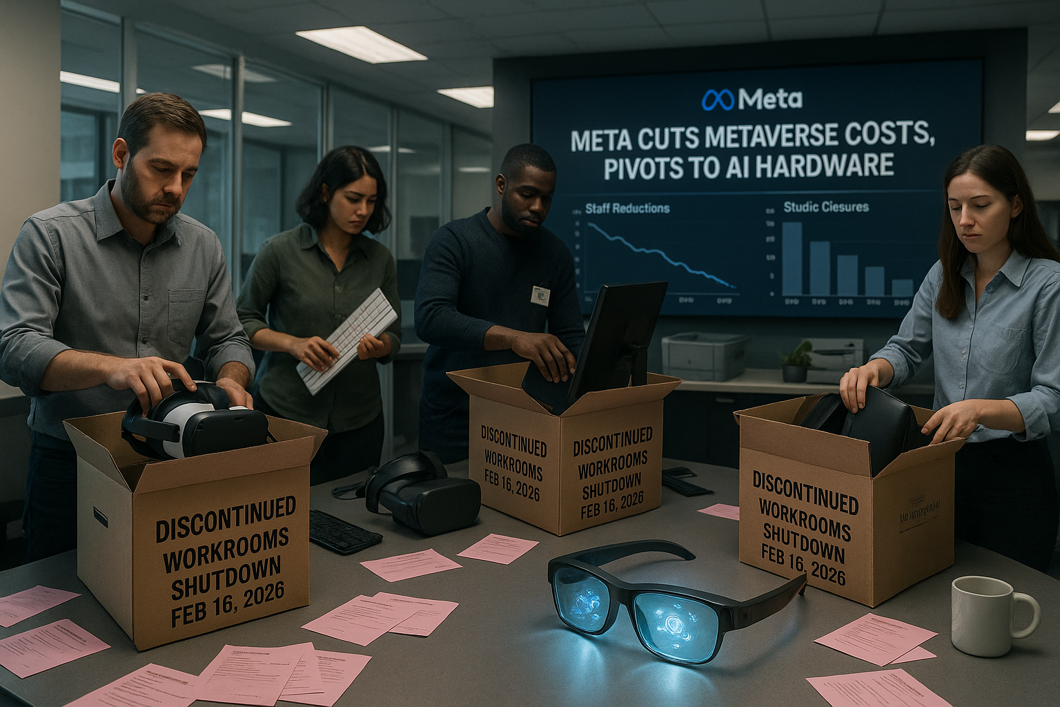 Meta employees packing VR gear amid Workrooms app shutdown and Reality Labs layoffs, spotlight on emerging AI smart glasses.