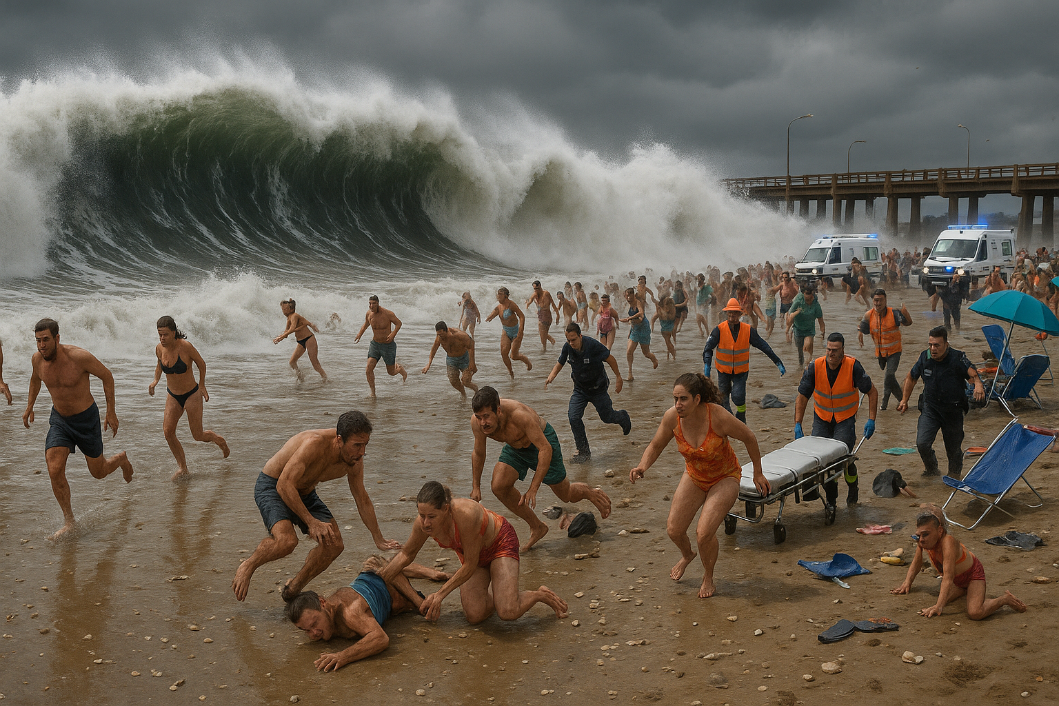 Dramatic meteotsunami wave crashing on Santa Clara del Mar beach, with panicked beachgoers fleeing and emergency services responding.