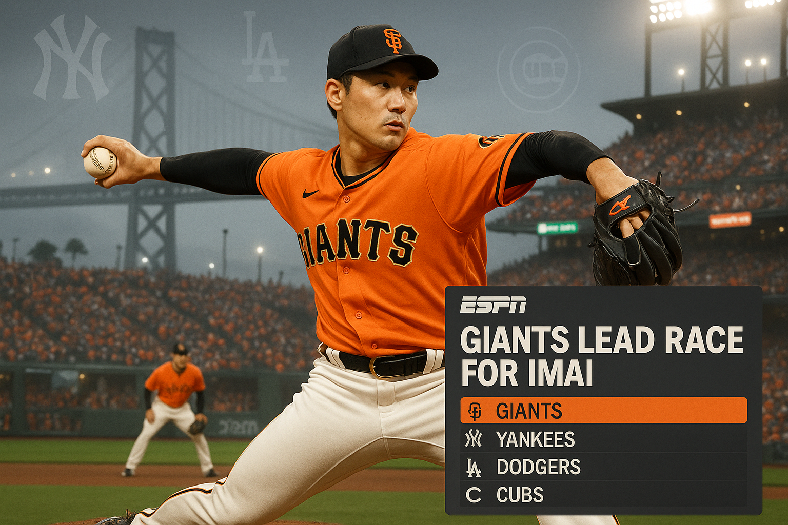 Photorealistic image of pitcher Tatsuya Imai in Giants uniform pitching at Oracle Park, illustrating MLB signing rumors with rival teams in background.