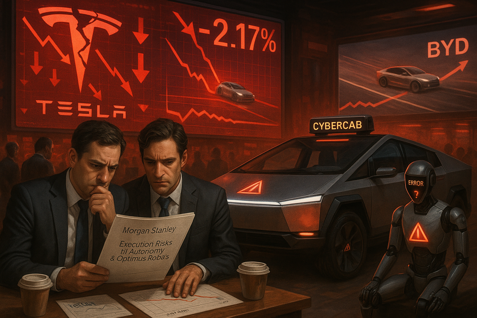 Conceptual illustration of Morgan Stanley's Tesla downgrade, showing stock decline, autonomy and robot risks amid EV competition.