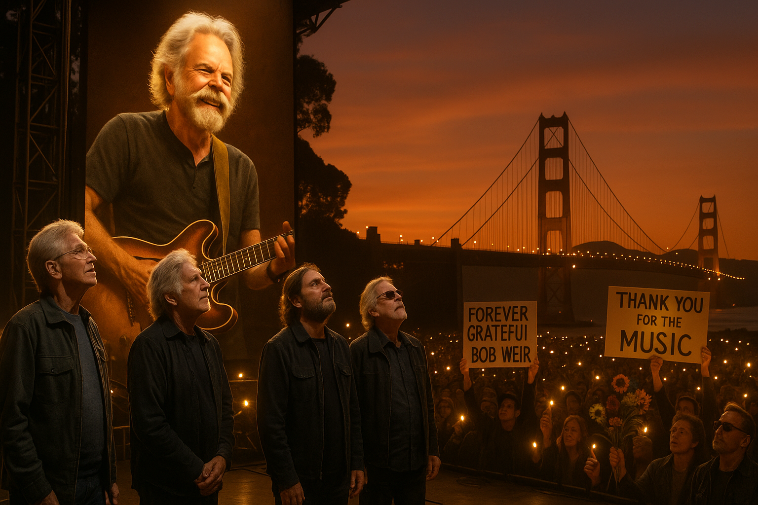 Musicians gather on Golden Gate Park stage paying emotional tribute to Grateful Dead co-founder Bob Weir, with his portrait, fans, and bridge backdrop.