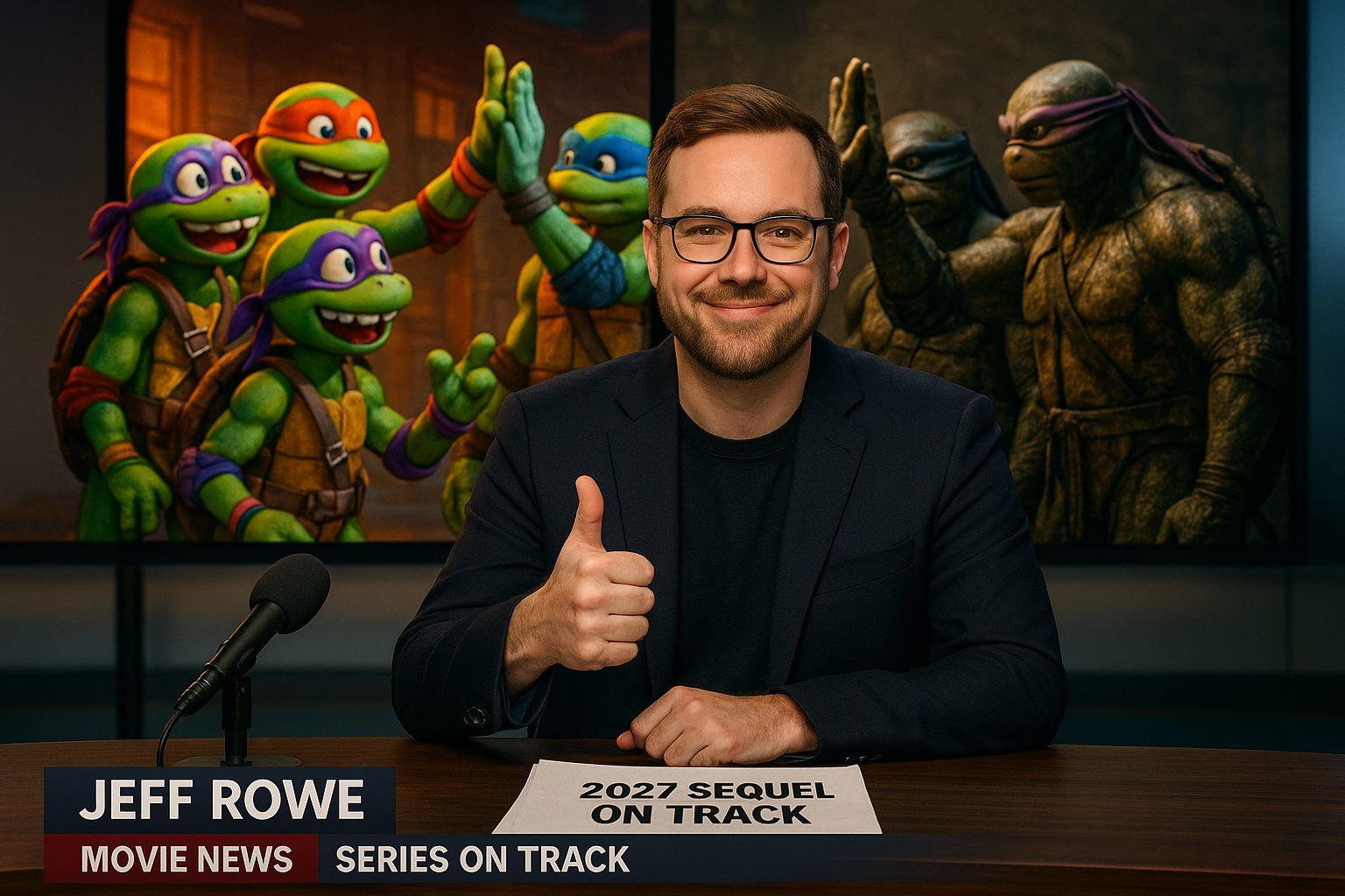 Director Jeff Rowe thumbs up between animated and live-action TMNT, illustrating no sequel impact.