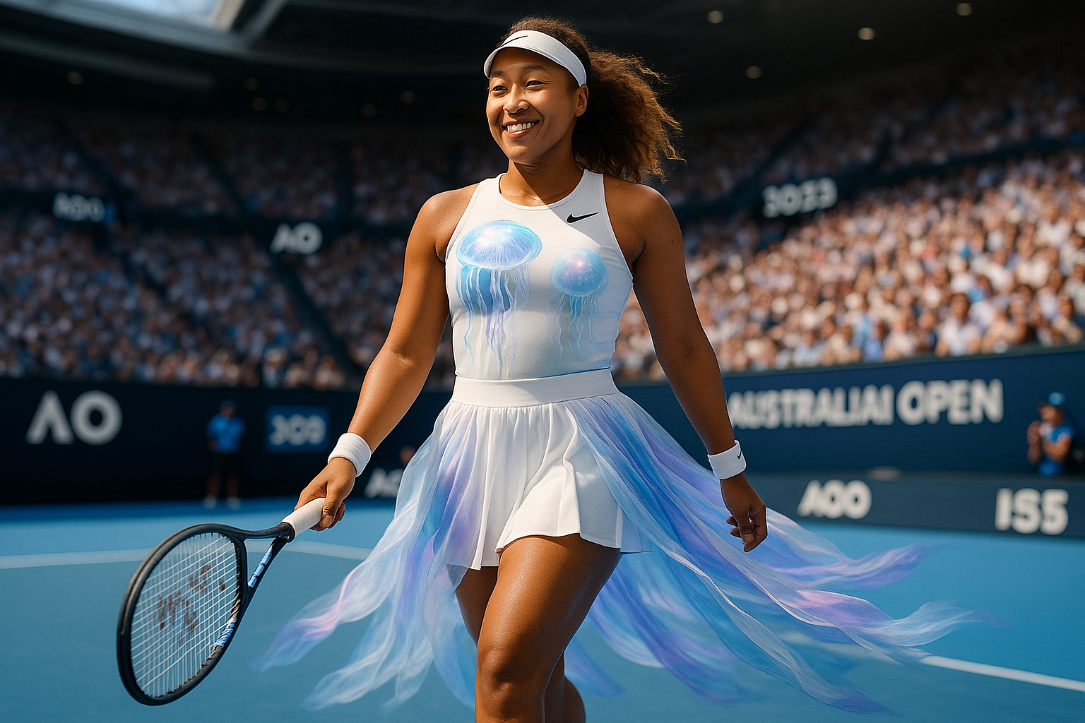 Naomi Osaka enters the 2026 Australian Open court in a stunning jellyfish-inspired outfit, captivating the crowd.