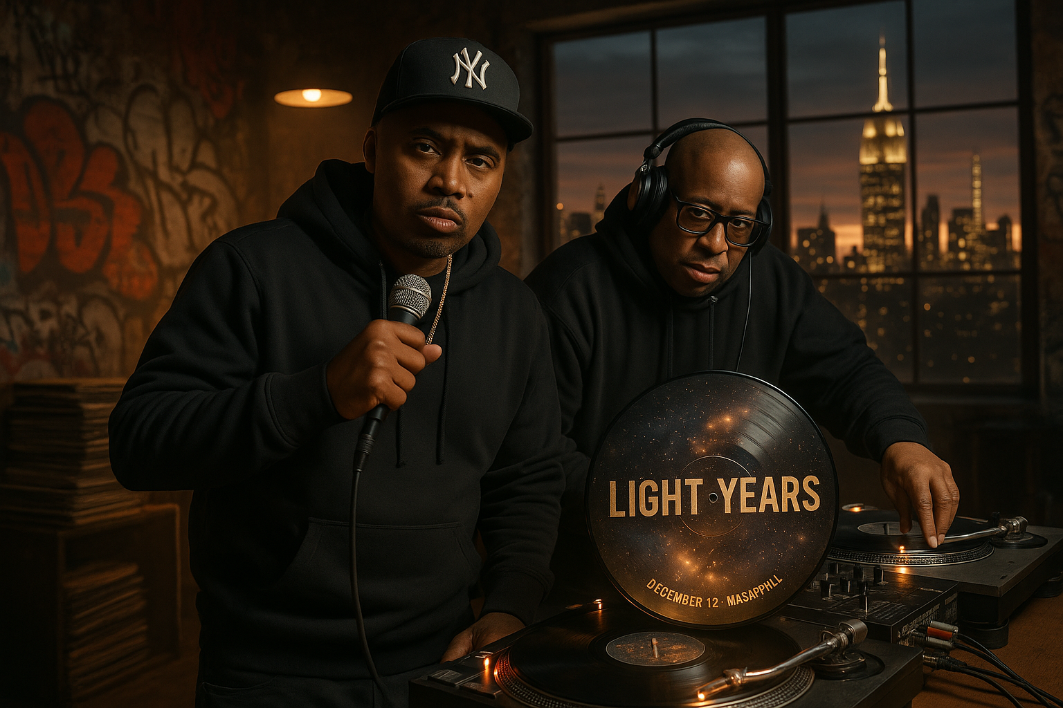 Nas and DJ Premier in a New York studio, unveiling their collaborative album 'Light-Years' set for December 12 release.