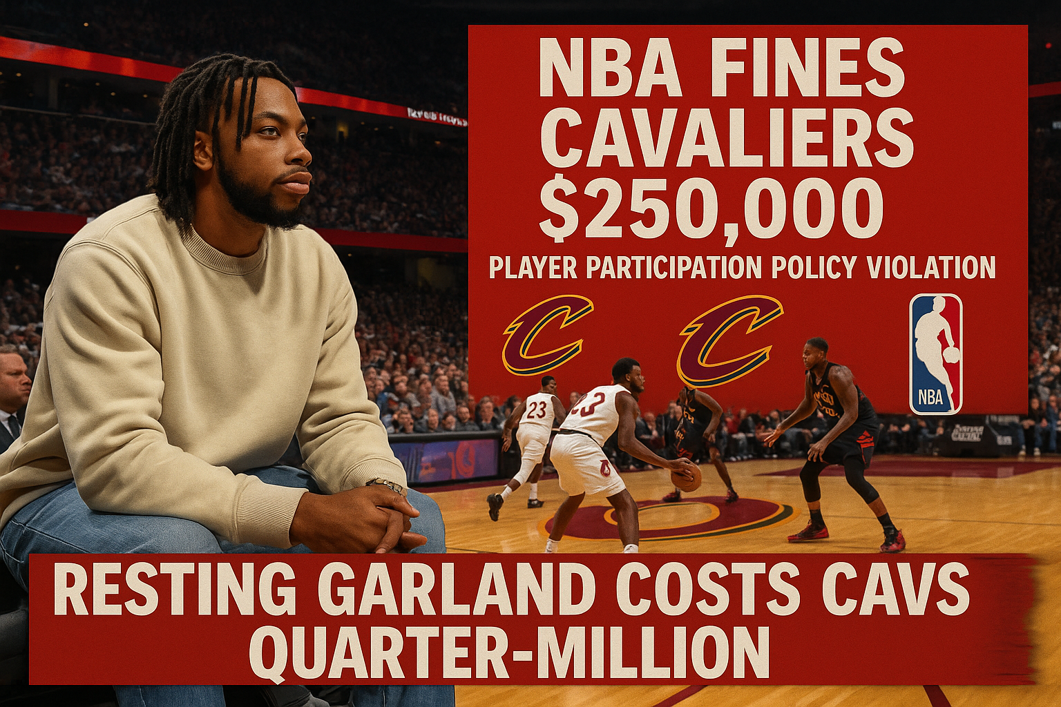 Illustration of NBA fining Cleveland Cavaliers $250,000 for resting Darius Garland in televised Raptors game, showing him on bench with fine overlay.
